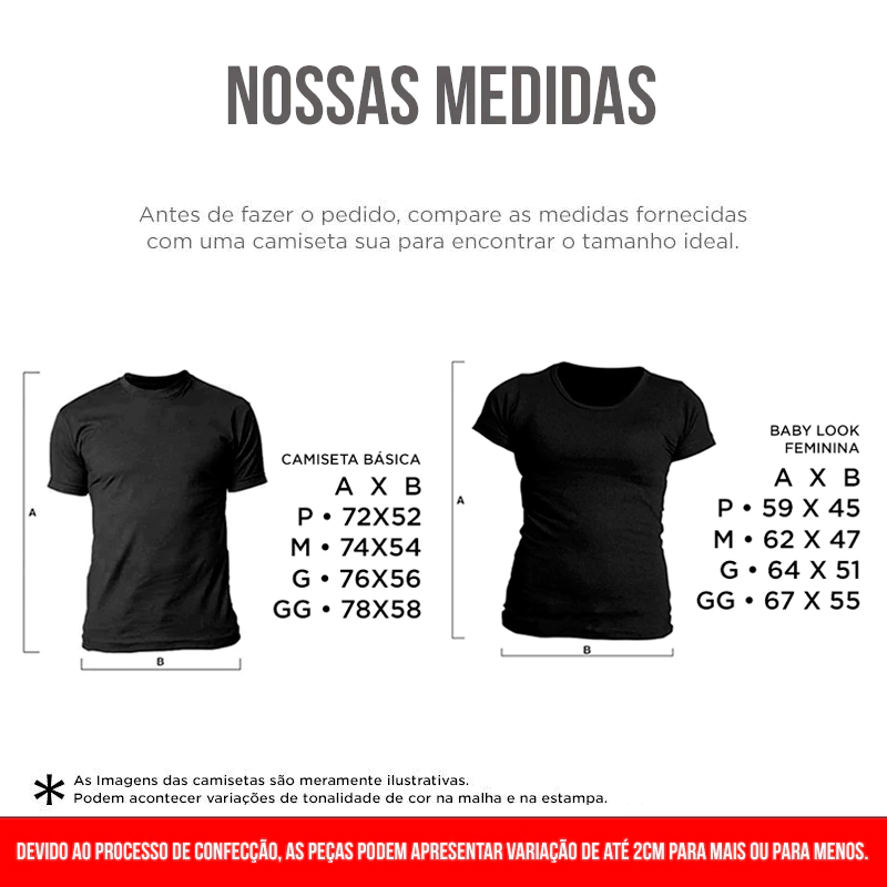*Antes de fazer o pedido, compare as medidas fornecidas com uma camiseta sua para encontrar o tamanho ideal. Devido ao processo de confecção, as medidas podem variar em até 2cm para mais ou para menos.