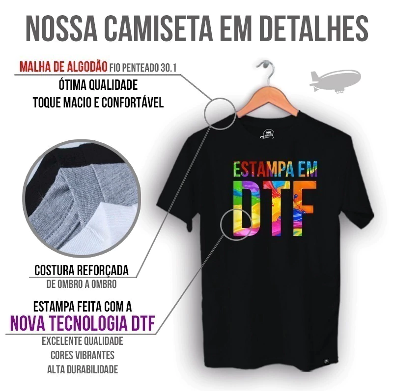 Para esta estampa utilizamos o DTF que é a mais moderna e tecnológica técnica de estampagem do mercado atualmente. Feitas com equipamento industrial de última geração, nossas estampas garantem cores vibrantes e alta durabilidade, com toque macio e confortável. Similares ao nosso silk-screen, não racham e não desbotam. Você vai adorar!!
