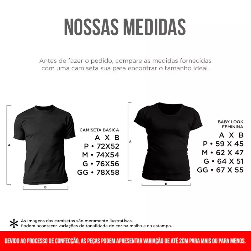 *ATENÇÃO: Antes de fazer o pedido, compare as medidas fornecidas com uma camiseta sua para encontrar o tamanho ideal. Devido ao processo de confecção, as medidas podem variar em até 2cm para mais ou para menos.