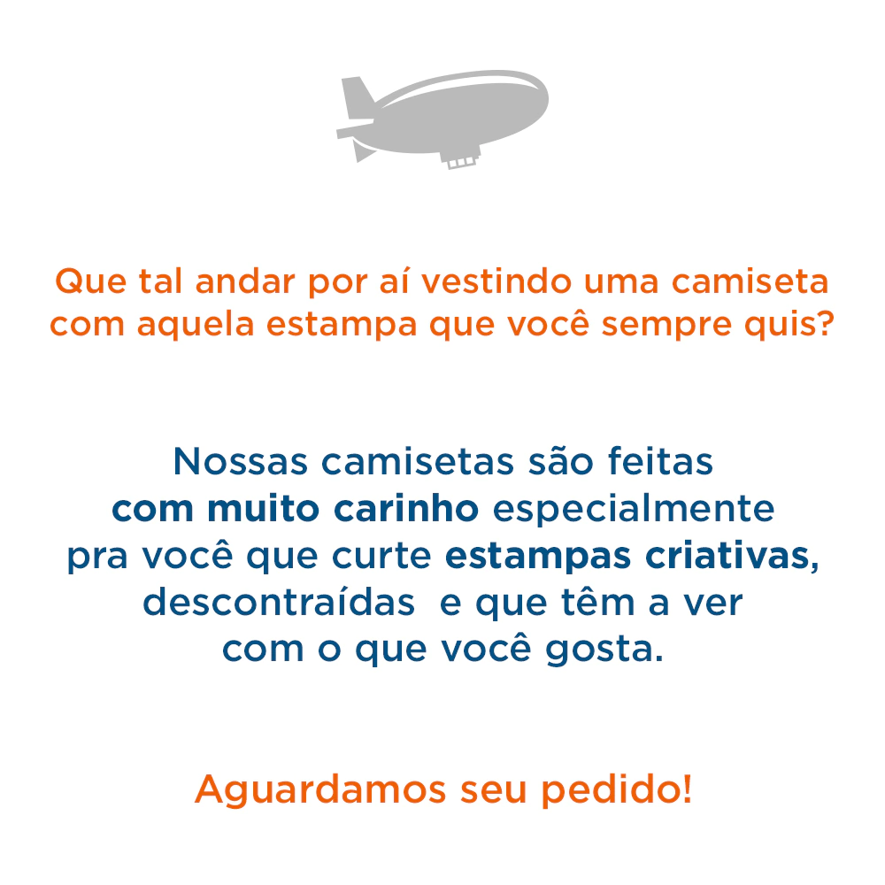 Nossas camisetas contam com modelagem exclusiva, moderna e ajustada, tanto feminina quanto masculina, com malha penteada de excelente qualidade, 100% algodão*, fio 30.1, com costura reforçada. A estampa é em silk-screen com ótimo acabamento.